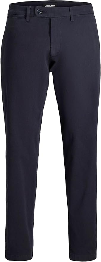 Pantalón chino de la marca JACK & JONES en color azul marino, confeccionado en tejido ligero y cómodo ideal para el día a día. Con un corte clásico y cintura regular, este modelo es perfecto para combinar tanto con camisetas casuales como con camisas más formales. Su precio de 12,02€ representa una excelente oportunidad para renovar el armario sin gastar mucho, ya que suele encontrarse a precios significativamente más altos en tiendas tradicionales.