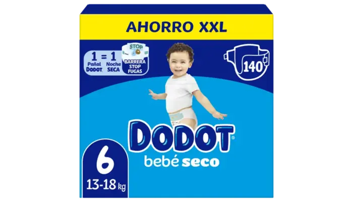 Pañales Dodot que mantienen la piel del bebé seca hasta doce horas con triple capa absorbente y protección antifugas. Pack ahorro ideal para familias que buscan comodidad y protección prolongada.