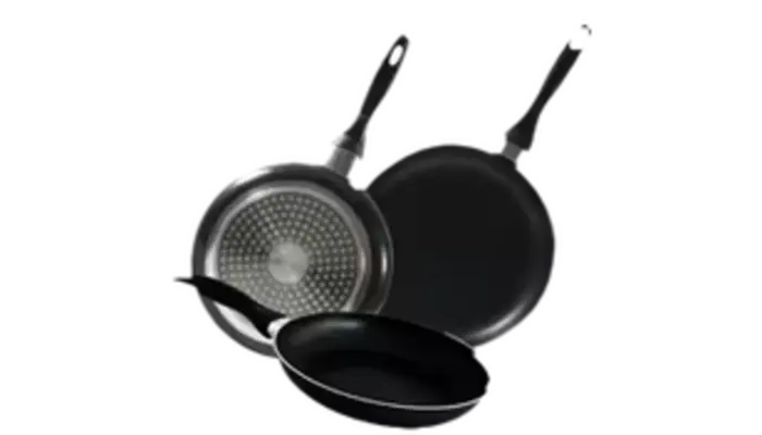 Juego de sartenes antiadherentes en aluminio prensado que permite cocinar con menos aceite y se limpia al instante. Ideal para cocinas de inducción y apto para todo tipo de alimentos.
