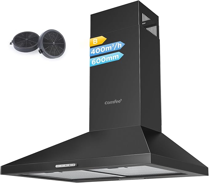 Campana extractora COMFEE PYRA17B60 de 60 cm con iluminación LED y filtros de carbón que elimina humo y olores rápidamente. Ofrece tres velocidades de extracción y dos modos de funcionamiento para adaptarse a cualquier tipo de cocina. Además incluye una guía en vídeo que facilita su instalación, lo que la convierte en una opción práctica y económica para renovar el aire de tu hogar sin gastar mucho.