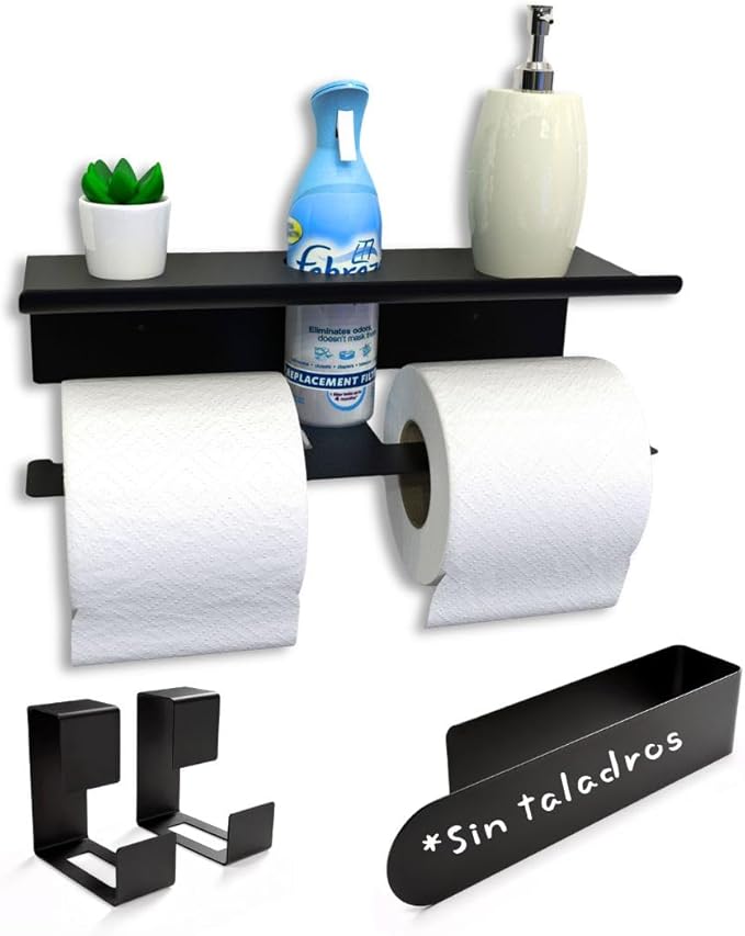 Set de baño de 4 piezas (portarrollos doble con balda, toallero y 2 ganchos) en acabado negro mate texturizado, diseñado para instalación sin taladro. Incluye todo lo necesario para un montaje sencillo y da un toque moderno al baño sin obras.