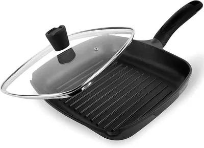 Sartén grill de 28 cm con revestimiento antiadherente sin PFOA y tapa de cristal. Ideal para asar carnes, verduras y más en cualquier tipo de cocina.