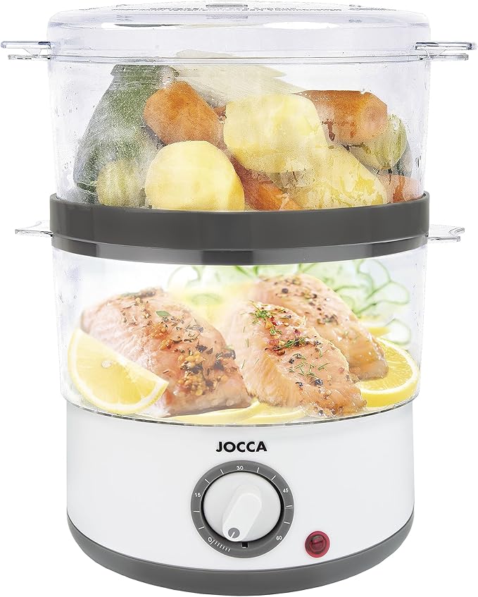 Vaporera eléctrica de 4,4 litros con doble altura y bandeja extraíble. Incluye temporizador de 60 minutos y clase de eficiencia energética A.